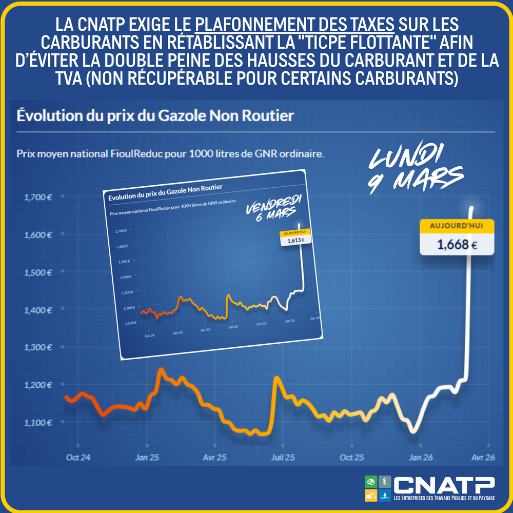 La CNATP, demande le plafonnement des taxes sur les carburants en rétablissant la « TICPE flottante », afin d’éviter la double peine pour les entreprises : hausse du prix des carburants et application de la TVA (non récupérable pour certains carburants).